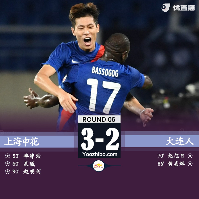 北京时间7月19日18:30,中超第6轮,上海申花对阵大连人。上半场,两队整体节奏较慢,陶强龙开场远射造险,曹赟定伤退;下半场,巴索戈助攻毕津浩头球破门,吴曦助申花2球领先,赵旭日扳回一城,黄嘉辉第87分钟扳平比分,赵明剑绝杀。最终,申花3-2击败大连人,收获近4轮首胜。