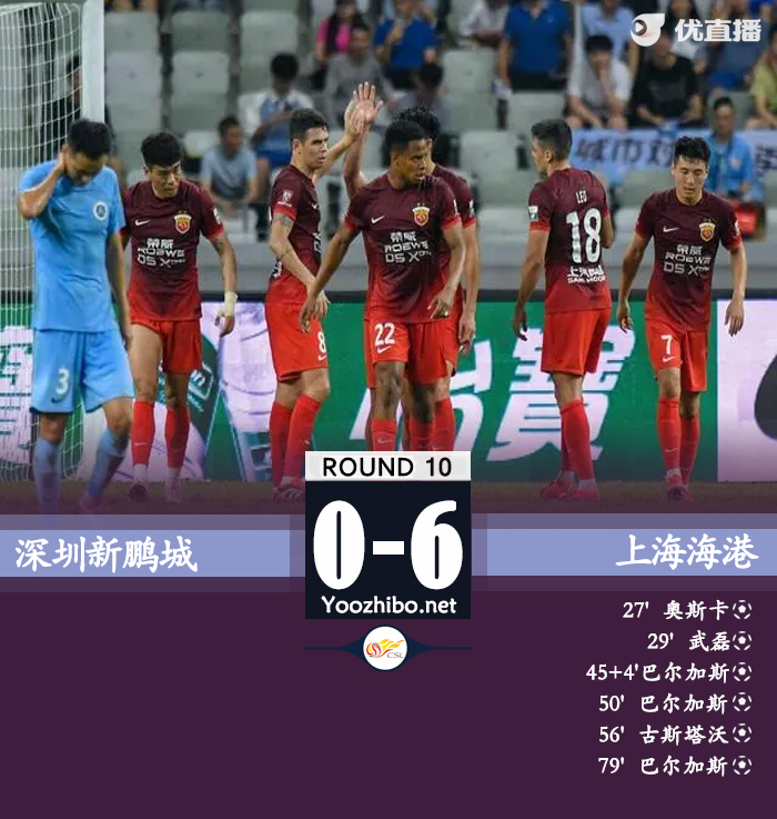 北京时间5月5日晚上20:00,中超第10轮,上海海港客场挑战深圳新鹏城。上半场,王浩开场8分钟放倒武磊吃到直红,李智送点奥斯卡笑纳,茹萨先后助攻武磊和巴尔加斯破门。下半场,巴尔加斯梅开二度,奥斯卡助攻古斯塔沃破门,奥斯卡造点巴尔加斯戴帽。全场结束,上海海港6-0深圳新鹏城。本场过后,上海海港6胜3平积21分排名第二,近两轮进11球失0球状态大火;深圳新鹏城2胜3平5负积8分,排名第12位。