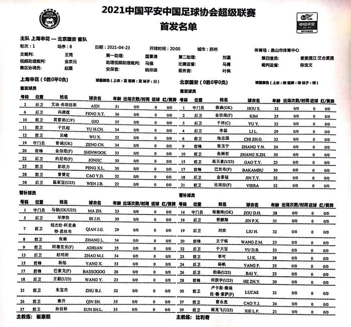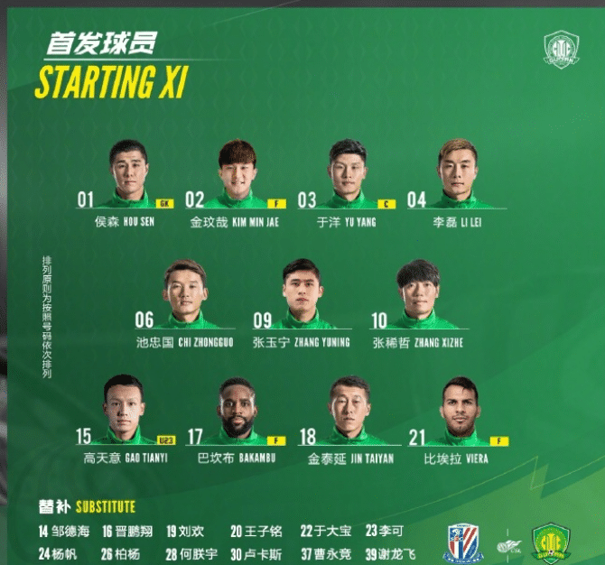 24直播网讯 北京时间4月23日,中超联赛第一轮,北京国安对阵上海申花,赛前,这场比赛的首发名单出炉。