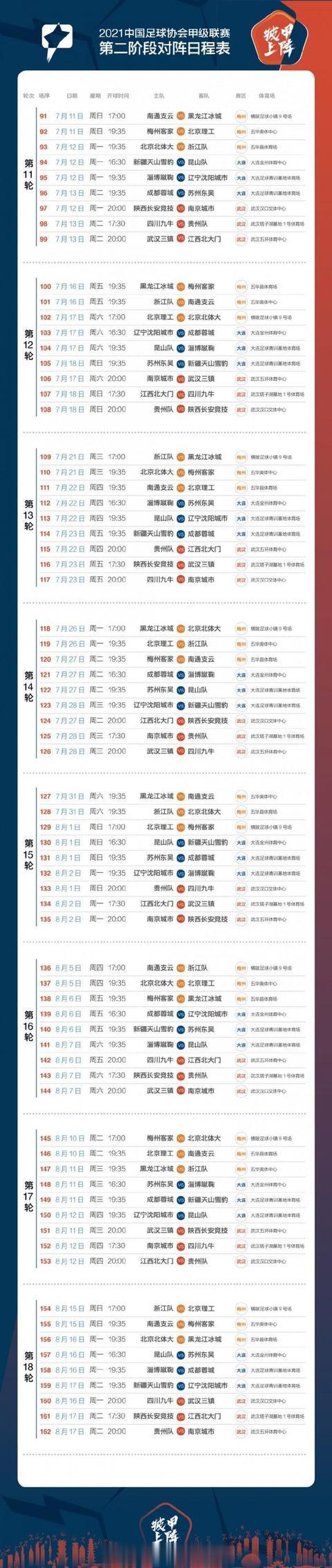 24直播网讯 今天,中甲联赛发布了第二阶段的日程表,第二阶段共8轮比赛,将于7月11日至8月17日之间进行。