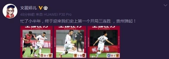 对于球队在新赛季开局阶段的表现,文筱婷在微博庆祝写道:“忙了小半年,终于迎来我们史上第一个开局三连胜 ,贵州弹起!”