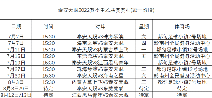 好球直播吧06月27日讯 日,中乙联赛官方宣布新赛季第一阶段详细赛程,泰安天贶第一场比赛是7月2日15时30分对阵珠海琴澳,这也是泰安足球的首场职业联赛。中乙联赛第一阶段总共有10轮比赛,比赛时间是7月2日到8月13日,泰安天贶将于6月28日出征黔南赛区,新赛季争取最好成绩。