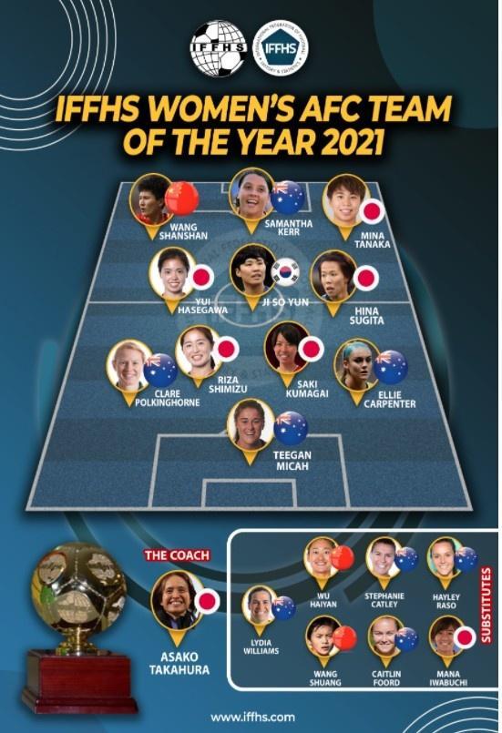 24直播网12月26日讯 IFFHS(国际足联历史与统计联合会)日前评选出2021年亚足联女足最佳阵容,王珊珊进入首发名单,王霜、吴海燕进入替补阵容。
