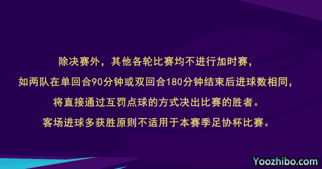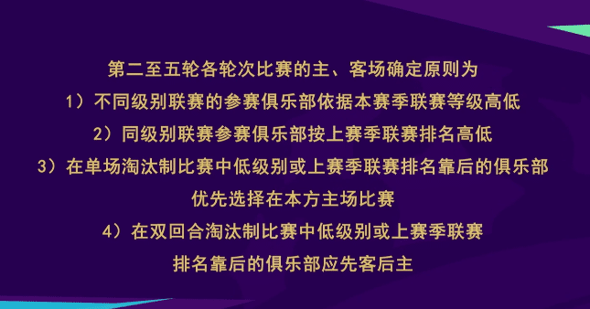 第二阶段开始,中超队全部参赛,第二轮和第三轮采用单场定胜负的赛制,第四轮和第五轮是两回合的赛制,决赛是单场定胜负,比赛地点由足协选定。主客场的选择方面,单场定胜负的比赛,同级别联赛的球队,上赛季排名靠后的球队可以选择主场,不同级别联赛的球队,低级别的球队优先选择主场。决赛之前的比赛都没有加时赛,如果打平将进行点球大战。