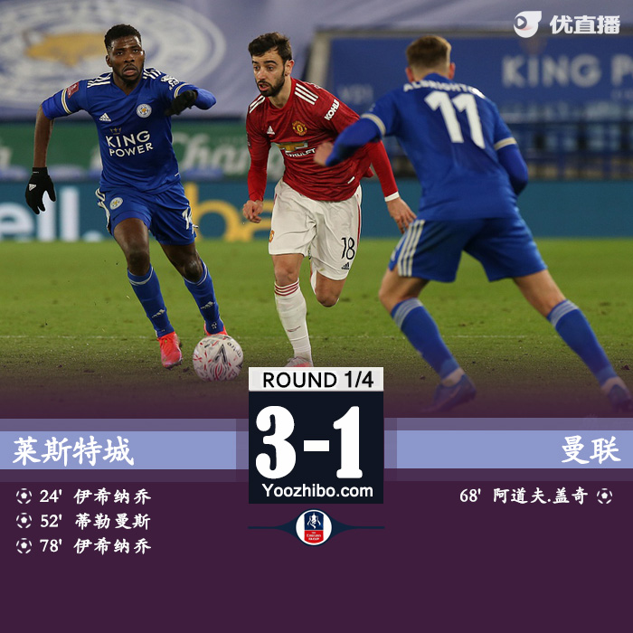 北京时间3月22日凌晨1点,20-21赛季足总杯1/4决赛,曼联客场挑战莱斯特城。上半时弗雷德回传失误,伊希纳乔笑纳大礼,博格巴助攻格林伍德扳平。下半时蒂莱曼斯一条龙突进破门,伊希纳乔完成梅开二度,瓦尔迪失良机。最终,莱斯特城3-1曼联,莱斯特城晋级足总杯四强,他的对手将是南安普顿。