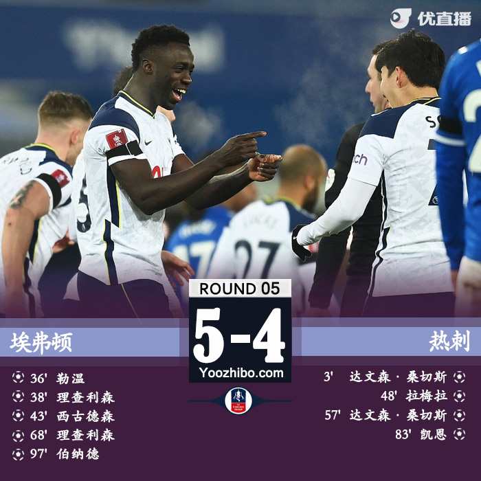 北京时间2月11日4:15,英格兰足总杯第五轮一场焦点战在埃弗顿和热刺之间进行。上半场桑切斯头球闪击,勒温造三球理查利森、西古德森建功太妃糖7分钟内逆转,拉梅拉补时扳回一球。下半场桑切斯打入个人第二球扳平比分,理查利森同样梅开二度,孙兴慜助攻凯恩破门,90分钟双方4-4进入加时。加时赛伯纳德抽射制胜。最终埃弗顿主场5-4逆转击败热刺挺进足总杯八强。