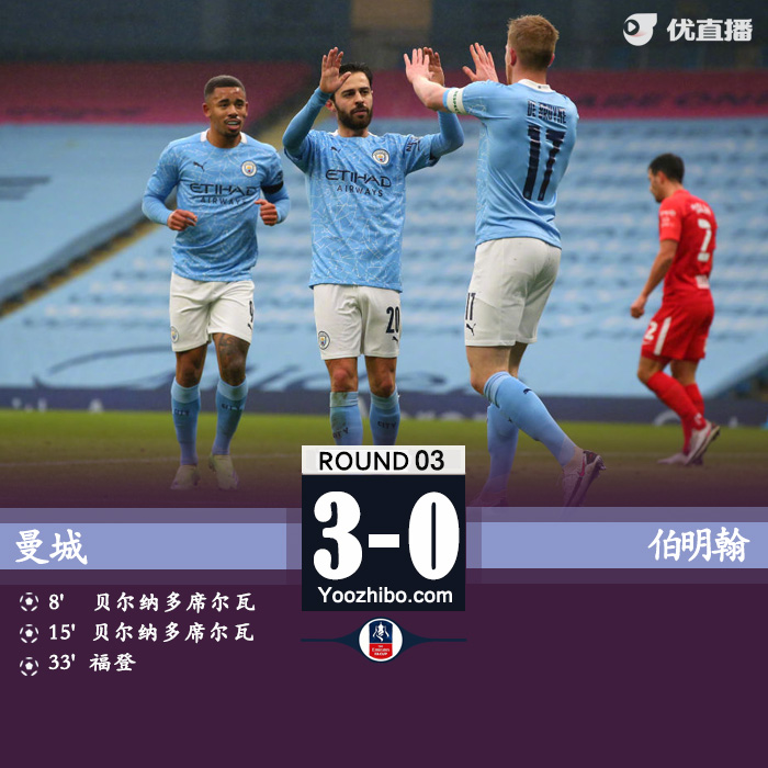 北京时间1月10日21:30,2020/21赛季足总杯第3轮比赛继续进行,曼城主场对阵伯明翰。上半场B席世界波破僵,随后推射破门梅开二度,福登低射再下一城。下半场马赫雷斯进球被吹。全场比赛结束,最终曼城3-0战胜伯明翰,顺利晋级下一轮。