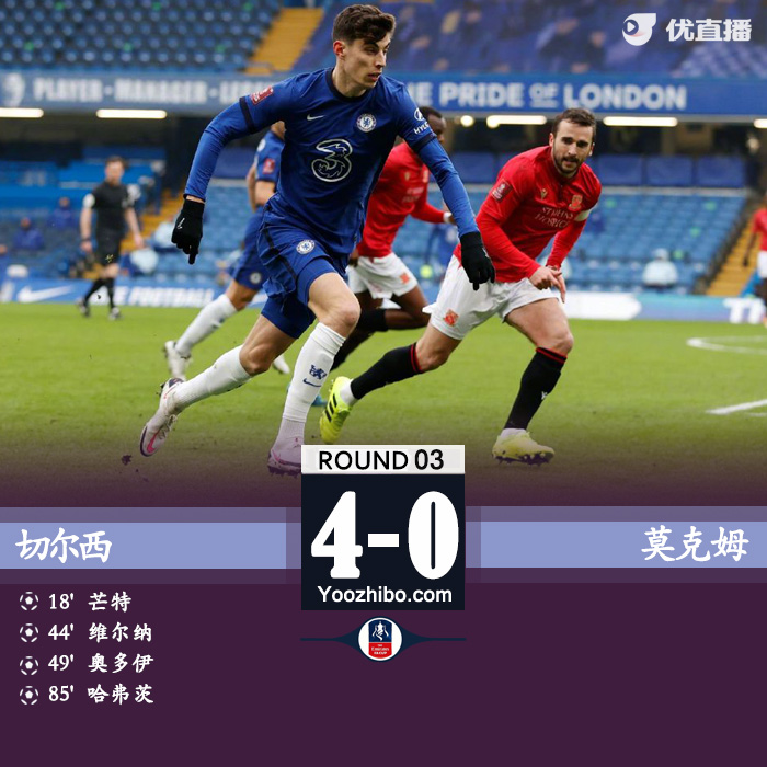 北京时间1月10日22:00,足总杯第3轮一场比赛在切尔西与英乙球队莫克姆之间进行。上半场菲利普斯冷射考验凯帕,芒特远射破门,哈弗茨助攻维尔纳打破12场球荒。下半场奥多伊再下一城,哈弗茨建功。最终切尔西4-0大胜莫克姆晋级足总杯第四轮。